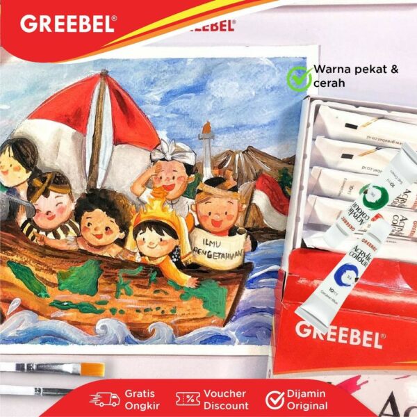 GREEBEL CAT AKRILIK SET ADALAH CAT LUKIS AKRILIK DENGAN 18 WARNA CERAH DALAM UKURAN 10 ML. COCOK UNTUK MELUKIS DI BERBAGAI MEDIA, CAT INI MENAWARKAN WARNA PEKAT, CEPAT KERING, DAN MUDAH DIGUNAKAN UNTUK TEKNIK LUKIS BERLAPIS. HASILNYA CERAH, MENGKILAP, DAN MEMILIKI DAYA LEKAT KUAT, MEMBUAT LUKISAN TAMPAK HIDUP DAN TAHAN LAMA.