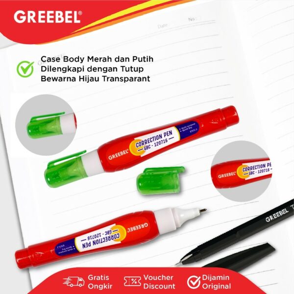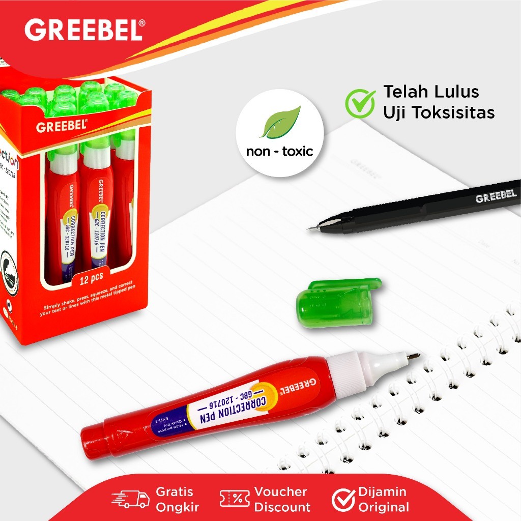GREEBEL Correction Pen Tip-Ex adalah pilihan terbaik untuk mengoreksi kesalahan tulis dengan cepat dan mudah. Dilengkapi dengan ujung pena presisi, koreksi jadi lebih rapi dan akurat, bahkan pada tulisan kecil. Dengan formula cairan yang cepat kering, Anda bisa langsung menulis ulang tanpa noda. Desain ergonomis membuatnya nyaman digenggam, ideal untuk pemakaian di rumah, sekolah, atau kantor.