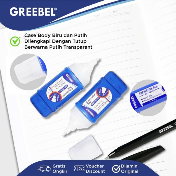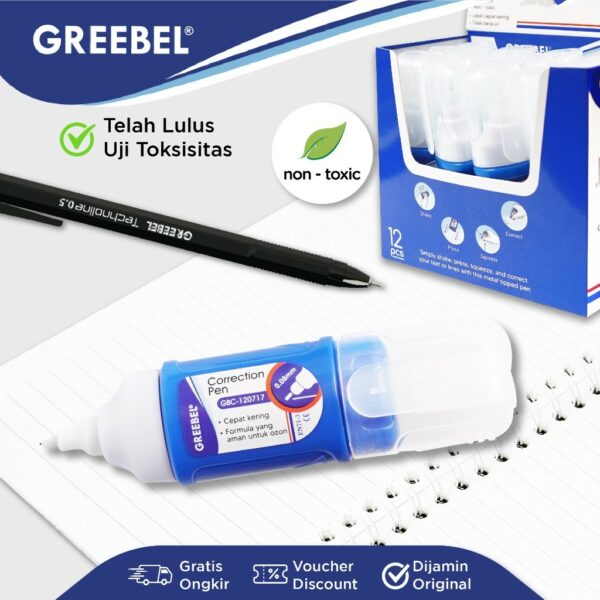GREEBEL Correction Pen Tip-Ex adalah pilihan terbaik untuk mengoreksi kesalahan tulis dengan cepat dan mudah. Dilengkapi dengan ujung pena presisi, koreksi jadi lebih rapi dan akurat, bahkan pada tulisan kecil. Dengan formula cairan yang cepat kering, Anda bisa langsung menulis ulang tanpa noda. Desain ergonomis membuatnya nyaman digenggam, ideal untuk pemakaian di rumah, sekolah, atau kantor.