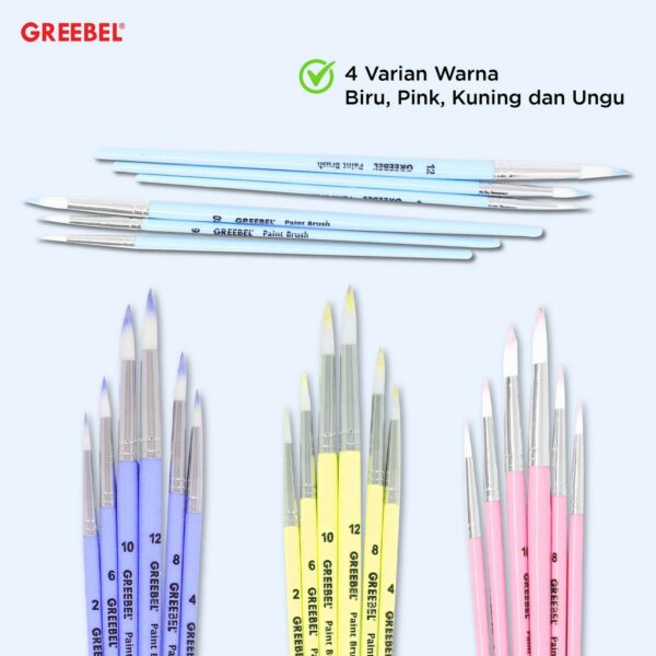 KUAS LUKIS GREEBEL KUAS LUKIS BERKUALITAS DENGAN TEXTURE HALUS DAN GAGANG ERGONOMIS, COCOK UNTUK MELUKIS DENGAN CAT AIR, AKRILIK, DAN CAT MINYAK. PILIHAN TEPAT UNTUK PEMULA DAN PROFESIONAL, TERSEDIA DALAM BERBAGAI UKURAN.