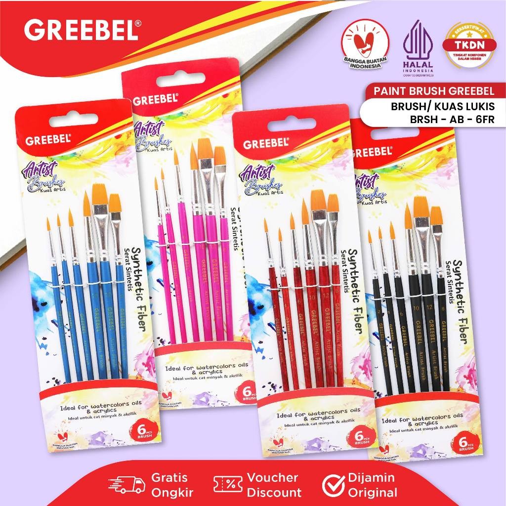 KUAS LUKIS GREEBEL KUAS LUKIS BERKUALITAS DENGAN TEXTURE HALUS DAN GAGANG ERGONOMIS, COCOK UNTUK MELUKIS DENGAN CAT AIR, AKRILIK, DAN CAT MINYAK. PILIHAN TEPAT UNTUK PEMULA DAN PROFESIONAL, TERSEDIA DALAM BERBAGAI UKURAN.