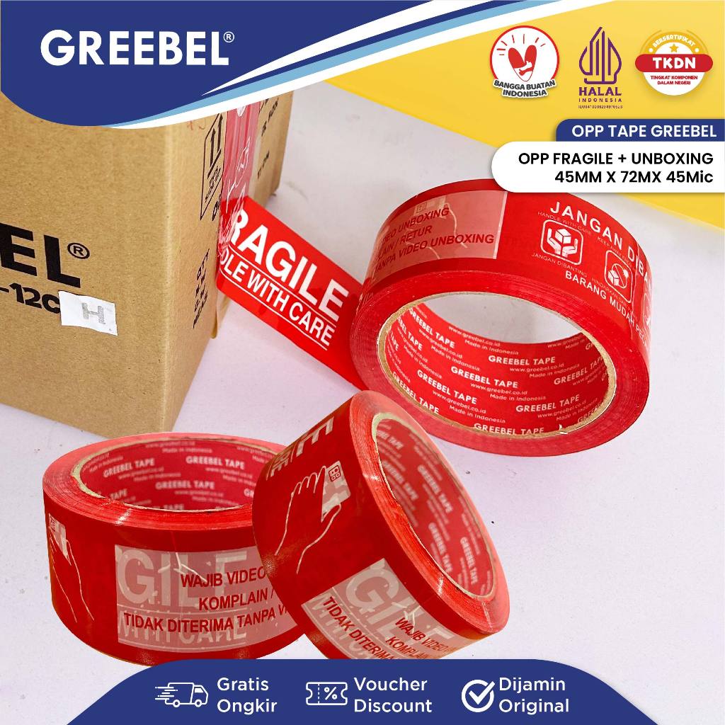 GREEBEL Lakban Fragile / Selotip Fragile dan Unboxing 45 MM X 72 YARD (PCS) / Opp Tape