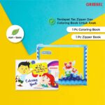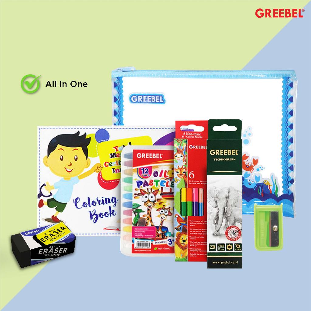 GREEBEL Stationery Set 720, paket alat tulis dan mewarnai lengkap untuk anak. Tersedia dengan desain tas zipper modern, termasuk oil pastels, buku mewarnai, pensil 2B, pensil warna, rautan, dan penghapus. Ideal untuk kegiatan sekolah dan kreativitas anak-anak.