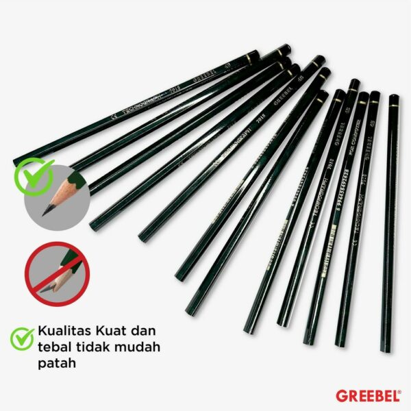 > Lebih hitam dibanding B Dan 2B Greebel , Minim Debu, Dan Empuk: Memberikan Goresan Yang Lebih Hitam, Sedikit Debu, Dan Nyaman Saat Digunakan Untuk Menulis Atau Mengisi Ljk.