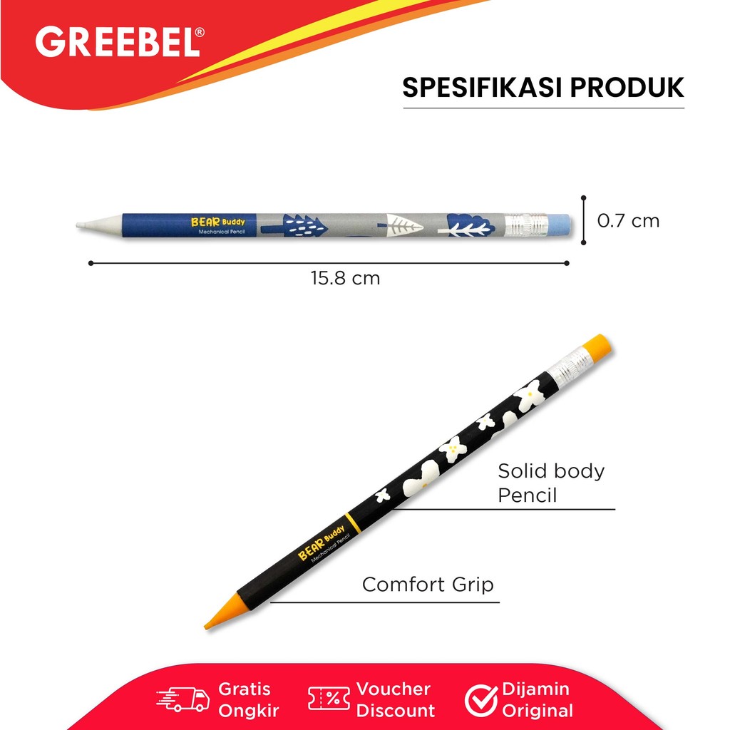 GREEBEL Pensil Mekanik PM-007 Bear Buddy (1PCS) / Mechanical Pencil Penghapus / Propelling Pencil Mechanic