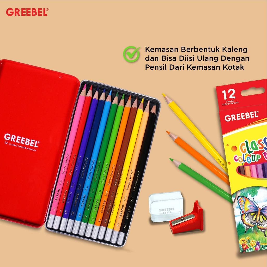 GREEBEL Pensil Warna Classic Tin Case 12 Warna hadir dengan kemasan kaleng premium yang praktis dan dapat diisi ulang. Dengan pilihan warna yang cerah dan nyata, pensil warna ini sangat cocok untuk memenuhi kebutuhan seni, baik untuk anak-anak maupun dewasa.