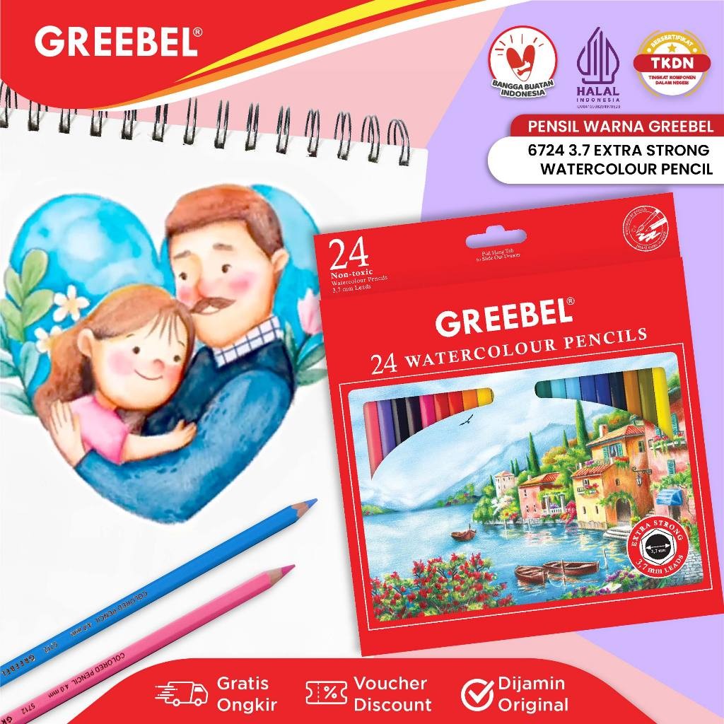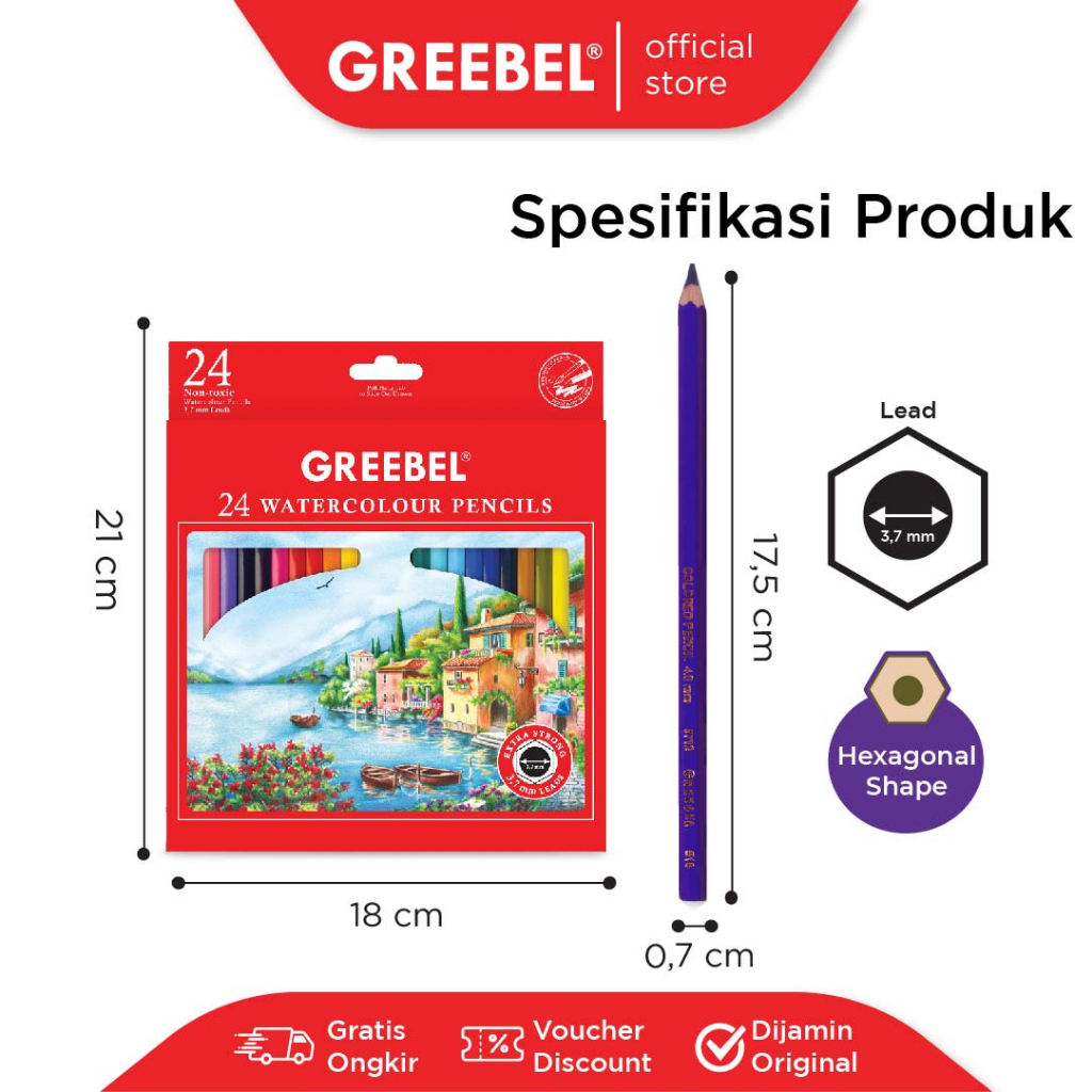 Produk water colour pencil 3.7 Greebel terdiri dari 12 , 24 dan 36 pilihan warna.