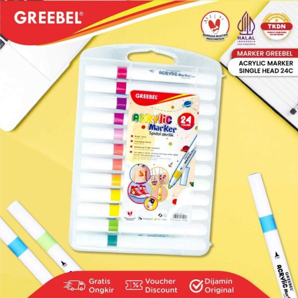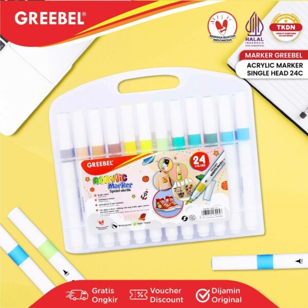 GREEBEL Acrylic Marker Single Head merupakan spidol sketsa / spidol berwarna warni yang biasa di gunakan untuk membuat gambar dikaca,tembok , sepatu maupun di baju yang biasa di gunakan oleh para seniman. Acrylic Marker Single Head di lengkapi dengan kotak berbentuk persegi yang terbuat dari plastik yang kuat dan mudah di bawa kemana saja. Acrylic Marker Single Head di lengkapi dengan warna-warna yang terang dan menarik serta tahan lama dan tidak mudah luntur yang terdiri dari 24 warna .