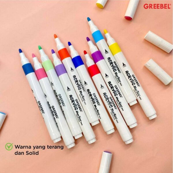GREEBEL Acrylic Marker Single Head merupakan spidol sketsa/ spidol berwarna warni yang biasa di gunakan untuk membuat gambar dikaca,tembok , sepatu maupun di baju yang biasa di gunakan oleh para seniman. Acrylic Marker Single Head di lengkapi dengan kotak berbentuk persegi yang terbuat dari plastik yang kuat dan mudah di bawa kemana saja. Acrylic Marker Single Head di lengkapi dengan warna- warna yang terang dan menarik serta tahan lama dan tidak mudah luntur yang terdiri dari 18 warna .