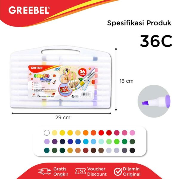 GREEBEL Acrylic Marker Single Head merupakan spidol sketsa / spidol berwarna warni yang biasa di gunakan untuk membuat gambar dikaca,tembok , sepatu maupun di baju yang biasa di gunakan oleh para seniman. Acrylic Marker Single Head di lengkapi dengan kotak berbentuk persegi yang terbuat dari plastik yang kuat dan mudah di bawa kemana saja. Acrylic Marker Single Head di lengkapi dengan warna-warna yang terang dan menarik serta tahan lama dan tidak mudah luntur yang terdiri dari 36 warna .