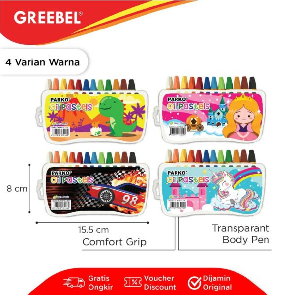 > Daya Lekat Optimal: Warna dari Crayon Parko menempel sempurna pada kertas, sehingga hasilnya tahan lama dan tidak mudah pudar.